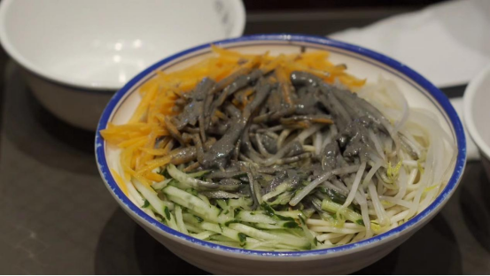 飲食文化也依時(shí)令隱含其中。民諺曰:“吃過夏至面,一天短一線?!毕闹脸悦媸呛芏嗟貐^(qū)的習(xí)俗。因夏至新麥已經(jīng)登場,所以夏至吃面也有嘗新的意思。除此之外,夏至吃糕團(tuán)也寓意著節(jié)節(jié)高升以及平安健康。美食鑒賞家樊老師帶領(lǐng)徐老師品嘗了南門頭的特色美食——夏至面以及糕團(tuán)。