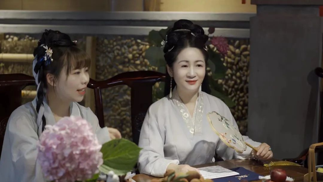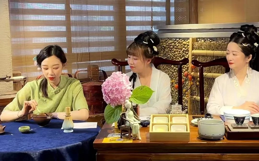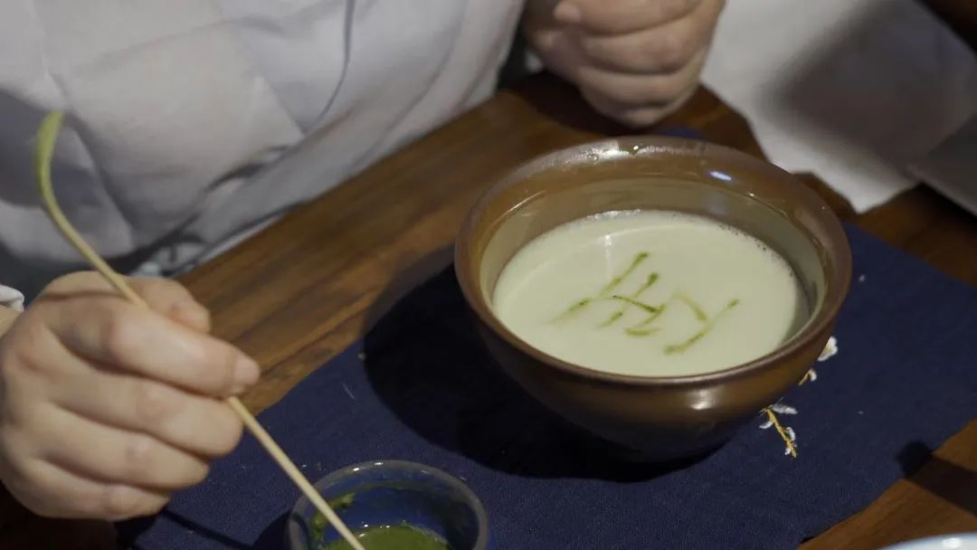 隨后,五芳齋小伙伴還嘗試了宋代“點(diǎn)茶”,先將茶葉磨成粉末,再投入碗里,注入水,注水時(shí)猶如蜻蜓點(diǎn)水,點(diǎn)茶之名由此而來。