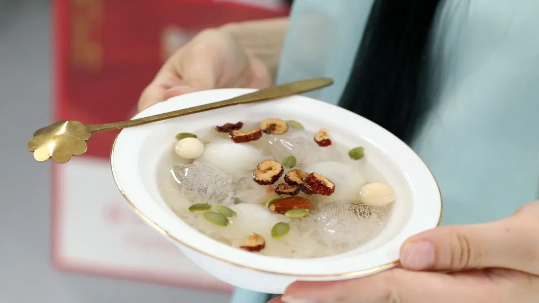 暑日心情容易煩躁,對此徐老師精心準備古人同款的消暑秘方——五芳齋版 “冰雪冷元子”,煮熟的湯圓在冰水里浸泡過后,搭配冰鎮(zhèn)的五芳齋綠豆百合粥和燕窩銀耳羹,冰冰涼涼,甜甜糯糯,一秒解暑。
