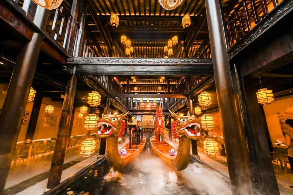 輕啟朱門,粉墻黛瓦,詩(shī)情畫意,一派風(fēng)情。抬望眼,霸氣的龍舟立于中庭,江南韻味十足的中式閣樓、小橋流水應(yīng)有盡有。傳統(tǒng)的木質(zhì)鉚接樓面,二十四節(jié)氣之景掩映其中,好一派溫柔的江南風(fēng)情。
