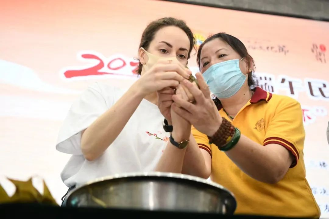 箬葉飄香、米粒翻飛,在外國友人選手們的努力下,一只只形狀各異的粽子也出爐了。