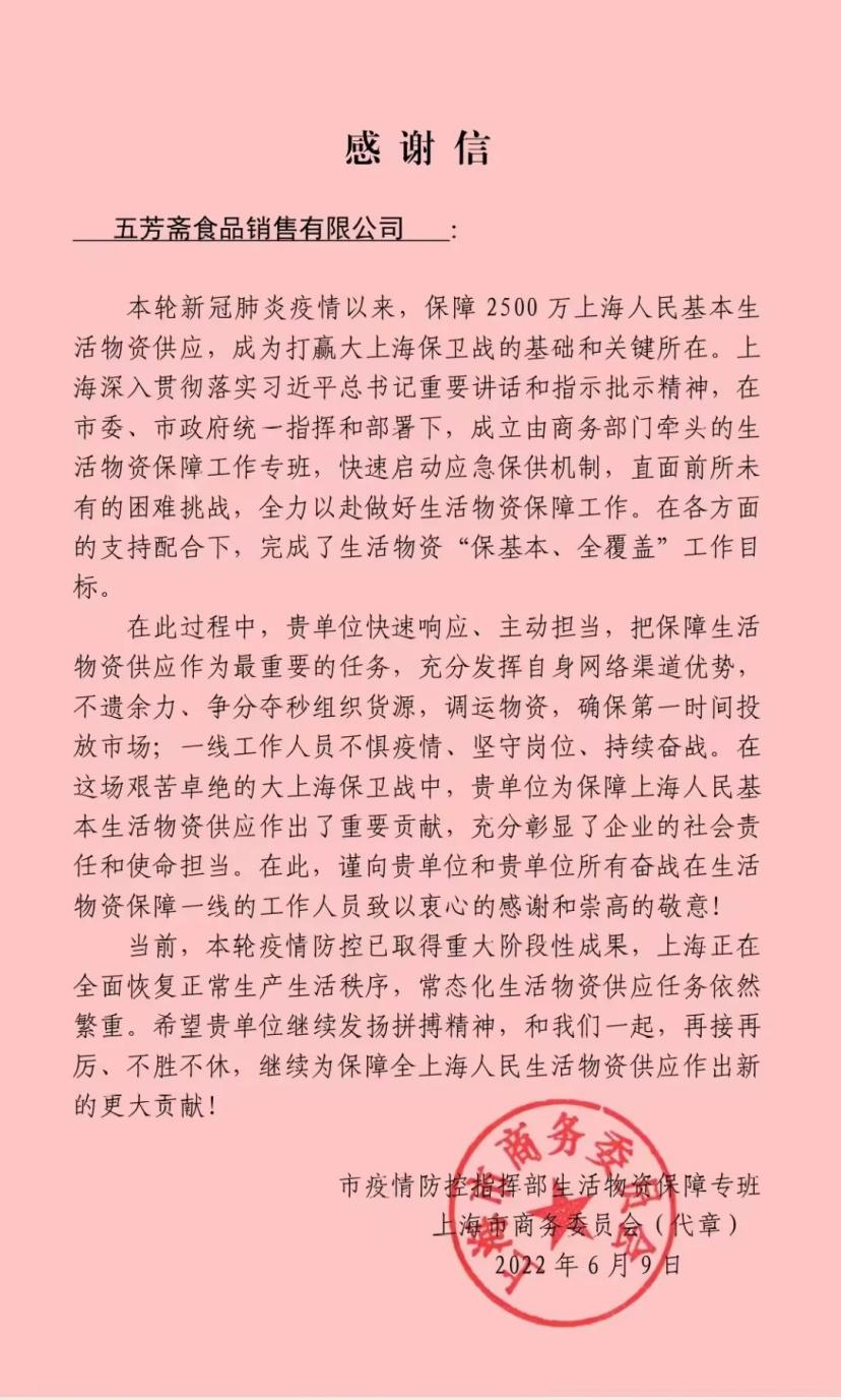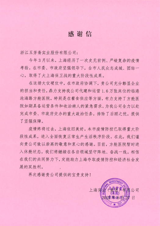 6月初,五芳齋收到了來自上海商務(wù)委員會、上海實業(yè)(集團(tuán))有限公司的感謝信,信中充分認(rèn)可了五芳齋在本輪上海新冠疫情抗疫保供工作中的積極作用,肯定了五芳齋的企業(yè)社會責(zé)任和使命擔(dān)當(dāng)。